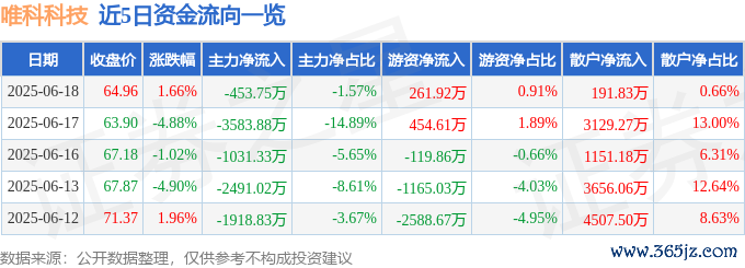 本站消息,截至2025年6月18日收盘,唯科科技(301196)报收于64.96元,上涨1.66%,换手率6.78%珺牛策略,成交量4.56万手,成交额2.89亿元。
