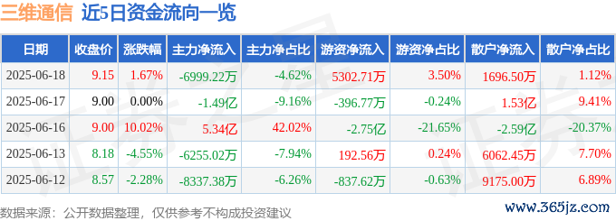 本站消息,截至2025年6月18日收盘锦盈多,三维通信(002115)报收于9.15元,上涨1.67%,换手率22.28%,成交量167.58万手,成交额15.14亿元。